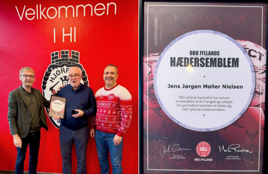 Hæderen blev overrakt af Bøje Holmsgaard Lundtoft fra DBU Jylland Region 1’s bestyrelse og formanden for Hjørring IF, Bo Jeppesen